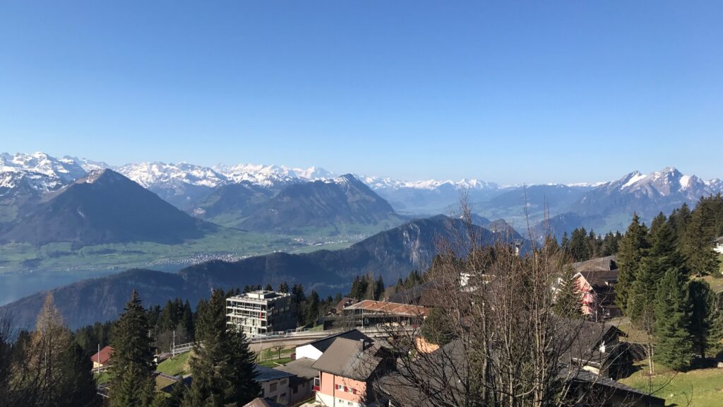 Der Balkon ist wie ein weiteres Wohnzimmer, allerdings an der frischen Luft und mit wunderbarer Aussicht. Die Sicht reicht vom Niederbauen, über den Titlis zum Stanserhorn bis hin zur Eigernordwand. Auf dem Balkon gibt es einen Tisch mit Stühlen und für den Sommer eine Schatten spendende Sonnenstore.