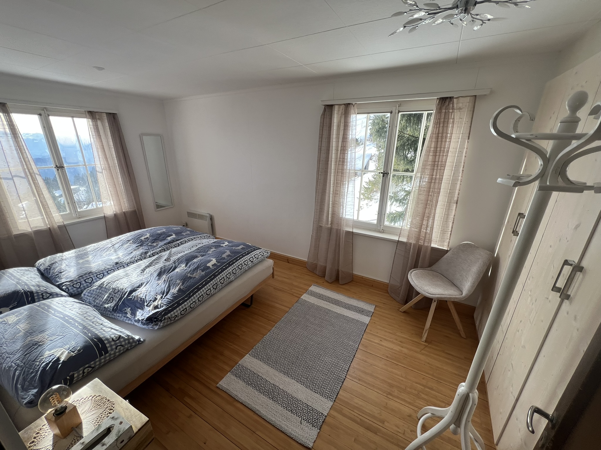 Das grosse Zimmer im Obergeschoss ist für 2 Personen gedacht und wie alle anderen Zimmer mit einer Heizung ausgestattet. Reisebett für Kleinkinder im Schrank.