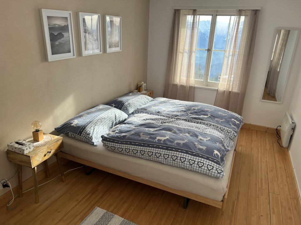 Jedes der drei Schlafzimmer bietet einen grandiosen Ausblick in die Berge. Im Haus gibt es Platz für maximal 8 Personen, empfohlen werden 5-7 Personen.